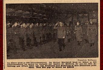 El Führer ha hablado en el mitin que se celebra anualmente en estas fechas en el Sportpalast de Berlín. El discurso del Führer, ante 5.000 jóvenes cadetes de oficial, ha supuesto una reafirmación de la lucha del pueblo alemán y de su Führer en un mismo objetivo: la salvación de Alemania.