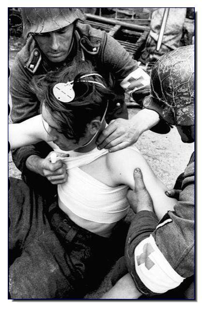 Médicos militares atienden a un camarada herido.La segunda Kriegswinterhilfswerk de la Cruz Roja, por tanto, debería unir a todos los alemanes, incluso más de lo que lo hizo la primera, en la alegre disposición a ayudar a nuestros héroes en lucha. Por lo tanto, renuevo mi llamada al Pueblo Alemán para que realice deonativos voluntarios a la segunda Kriegswinterhilfswerk de la Cruz Roja para que proporcione a los heridos y enfermos, que como los mejores soldados del mundo se están sacrificando por su Pueblo, el mejor cuidado como un regalo desde la patria.