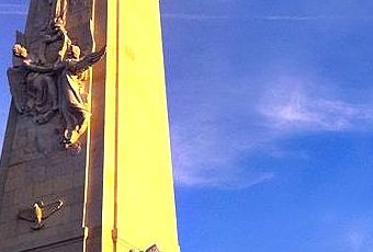 Los restos del antiguo monumento, el original, aún pueden verse frente al nuevo conjunto escultural.
