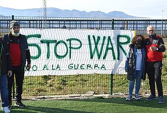 Son imágenes que se van sucediendo en todo el mundo y en diferentes ámbitos, las banderas de apoyo a Ucrania y la petición de parar la guerra, se deja sentir en los campos del fútbol base bercianos.