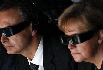 Tendré que replantearme esto del tres dé. Zapatero afirma que "el futuro de la UE es digital" y, muy apropiado para la ocasión, se ha enfundado las gafas de culo de botella con la Merkel en la última feria internacional de telecomunicaciones. Será que se pone uno las lentes de El Porrina y ve el futuro más real, como si pudieras tocarlo. Quizá por esta razón el gesto de la parejita no es del todo halagüeño. Y es que eso de ver el futuro puede que no será tan recomendable, más y cuando mira uno al cielo y ve esas nubes borrascosas que nos aguan el futuro.