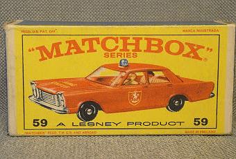 Cajas de cartón que conservo en la gran mayoría de mis Matchbox de la infancia. Como en este caso del auto del jefe de bomberos (Fire Chief Car). Este Ford Galaxie debe ser de mediados de los años sesenta por el tipo de ruedas de plástico negro que tiene.