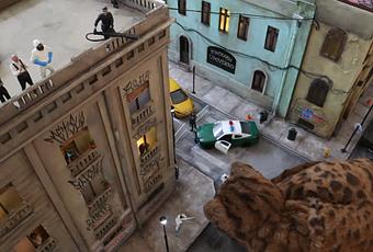 El diorama en pequeña escala muestra una escena emplazada en una calle ficcionada de Santiago centro. En ésta un gato huiña gigante duerme y a la vez interrumpe la paz de los humanos que la habitan. La obra presenta gran cantidad de detalles, pequeñas ventanas que nos dirigen a una amplitud de significados, que hilados unos con otros van contando una historia en la que el eje principal es un estado de alerta. Existe ciertamente, una tensión entre los personajes humanos y no humanos.