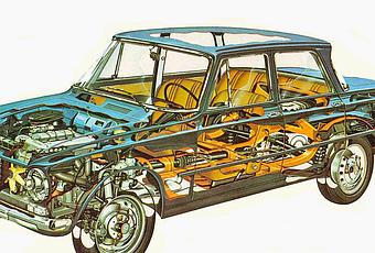 El dibujo que nos muestra las entrañas del Alfa Romeo Giulia 1300 del año 1964 no tiene firma del ilustrador y fue tomado de la Enciclopedia Salvat del Automóvil editada en España en el año 1974.