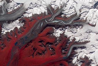 Esta imagen del glaciar Susitna la tomó en agosto de 2009 el sensor de teledetección llamado Advanced Spaceborne Thermal Emission and Reflection Radiometer (ASTER) situado a bordo del satélite de la NASA Terra, en falso color en donde se combinan las longitudes de onda visible e infrarroja para destacar la vegetación en rojo y la superficie de hielo de distintos tonos de gris dependiendo de su acumulación de sedimentos. Foto: NASA Image of the Day. Clic para ampliar.