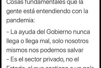 Si algo es innegable es que son los productores de bienes y servicios somos quienes mantenemos en flote un país, el gobierno ademas de ser una sanguijuela que vive de nuestros impuestos nos pone leyes estúpidas que dificultan el trabajo y por ultimo todo aquello en que se supone que dependemos del gobierno siempre termina mal.Aunque lamentablemente se necesita una entidad(el gobierno) que garantice ciertas obras de interés publico y defensa del estado ante enemigos externos, lo cierto es que en la mayoría de casos sea el gobierno de la ideología que sea, no hace bien la gran mayoría de funciones que le corresponden, por lo cual lo mas sensato es que se dependa lo menos posible del mismo.La gente demanda ayudas del gobierno y mas en estos tiempos, pero no se dan cuenta que nada de lo que da el gobierno es gratis, todo lo que da el gobierno sale de nuestros impuestos, no tiene sentido pagar una millonada de impuestos al gobierno para que este de unas limosnas a unos cuantos mientras se roba el resto del dinero.Lo que nos jodió en los últimos meses no fue un virus, fueron leyes estúpidas que no supieron hacerle frente, leyes que perjudicaron mas de lo que ayudaron, como somos los individuos quienes creamos prosperidad en una sociedad, esta en nosotros ser mejores personas moral, cultural e intelectualmente para que nuestras sociedades prosperen y no dependan de gobiernos mediocres que solo arruinan todo lo que tocan.