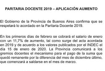 El gobierno de la Provincia de Buenos Aires acaba de notificar a los docentes que no se podrá cumplir con el acuerdo paritario 2019 (no pagarán la última cuota de la cláusula gatillo). Se pagará con el salario de MARZO.