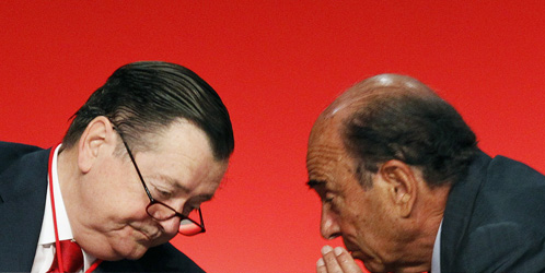 El presidente del Banco Santander, Emilio Botín (d) conversa con el consejero delegado, Alfredo Saenz (i)