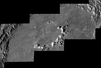 Hokusai es uno de los cráteres jóvenes más grandes que hay en Mercurio. Tiene 114 kilómetros de diámetro y sus brillantes rayos se extienden por gran parte del planeta . Esta composición de vistas oblicuas es un primer plano de Hokusai que muestra los picos soleados del centro, las paredes en terrazas y el mar congelado de lava en el fondo del cráter . La sonda MESSENGER, la primera que orbita Mercurio, hizo las fotografías. Desde 2011, MESSENGER ha llevado a cabo varias exploraciones científicas , entre las que hay una extensa imagen del planeta más interior del Sistema Solar. Actualmente ha agotado el combustible y no está en condiciones de contrarrestar las perturbaciones orbitales causadas por la gravedad del Sol. Se espera que el 30 de abril MESSENGER se estrelle contra la superficie de Mercurio.