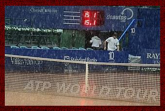 Juan Mónaco (4º sembrado en esta décima edición) y Horacio Zeballos (8º) ingresaron al court central del Buenos Aires Lawn Tennis Club para su partido de cuartos de final de la Copa Telmex bajo unas amenazantes nubes, que -desde temprano- se llevaban todas las miradas. Cuando el marcador indicaba 1-1 (15 iguales), la fuerte lluvia que caía obligó la suspensión –por el momento- de toda la programación del quinto día del ATP porteño.No hay mucho optimismo de que cambie el clima en lo inmediato, por lo que los organizadores, jugadores y espectadores tendrán que aguardar para ver cómo sigue la historia en la catedral, que viene mojada desde el inicio del main draw.