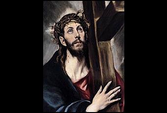 Detalle de Cristo abrazado a la cruz (1580-85).Cristo está idealizado sin sufrimiento, destacando el significado de la salvación. Nos lo muestra sereno y triunfante, mirando al cielo, la cruz no parece pesada. Eran los ideales de la Contrarreforma.