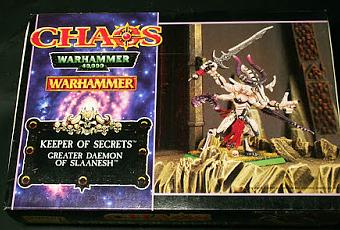 Este gran demonio fue diseñado por Trish Morrison en 1999 durante la quinta edición de Warhammer Fantasy Battle o la tercera edición de Warhammer 40000 porque todos los demonios son compatibles para estos dos juegos. En estas cajas ya empezaban a anunciar su uso en ambos juegos. Creo que este fue el último gran demonio renovado. Todos estos demonios eran más grande que sus antecesores. Tengo estos cuatro demonios aunque sólo tengo montado y pintado el Gran Demonio de Khorne.