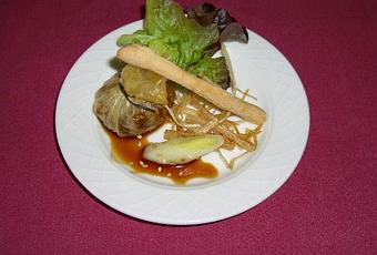 Troceamos las verduras y las saltemoas hasta que esten bien cocidas, añadir la carne de la Morcilla saltear durante un minuto, dejamos repozar, Precalentar el horno a 200º, una vez fria la mezcla la escurrimos y reservamos el jugo, montamos los hatillos de la pasta Brick incorporando un datil en trocito, atar el hatillo para que no se desmonte con un hilo de cocina, poner en el Horno 8 minutos o hasta que la masa este tostada y crujiente, lo servimos en elplato con unas lechugas y una patatas pajas, y un poco del jugo de haber salteado las verduras que habiamos reservado, y unos granitos de sesamo.