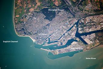 La ciudad portuaria de Le Havre se encuentra en la confluencia del río Sena y el Canal de La Mancha a lo largo de la costa norte de Francia ( región Alta Normandía ) . Es el mayor puerto de contenedores en Francia, y el segundo más grande en tráfico total después de Marsella . Las amplias instalaciones portuarias, visible en el centro de la imagen , incluyen numerosos muelles (grandes buques de carga claramente visibles ) , tanques de almacenamiento de petróleo y otros productos químicos , y las grandes instalaciones industriales o almacenes con techos blancos.