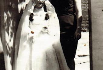 Me faltaba poco para cumplir 8 años. Antes de irnos hacia la iglesia, en el barrio de Canillas, nos hicieron esta fotografía bajo la sombra del membrillo, abierta la puerta del patio de las maravillas a la calle de mis juegos. Una calle sin asfalto, con charcos. Una calle ancha sin aceras por la que apenas circulaban coches.