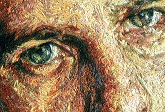 Cayce plasma las sombras, las luces y los colores con tanta seguridad como un maestro de la pintura. Utiliza los hilos como si fueran un lápiz: no sigue una única dirección sino que se adapta a las formas de la piel, el pelo o las vestiduras. De esta manera sus cuadros obtienen texturas y efectos visuales increíbles, cercanos al impresionismo. ¿No os recuerdan un poco al famoso autorretrato de Van Gogh?