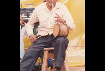 En las celebraciones culturales que con frecuencia se hacían para entretener a aquella humanidad exiliada, para dar breve tregua a la memoria de la guerra, de las calamidades, siempre había un hueco para él entre los teatrillos, las danzas y las canciones. El hombre se sentaba en un zancudo, con la pierna izquierda apoyada en el travesaño y el tamboril acomodado sobre el muslo, de canto. Con la mano derecha manejaba el palillo y con la izquierda, cuya muñeca descansaba en el tamboril para sujetarlo, sostenía el extremo de una flauta de caña con dos orificios, pintada de azul y blanco.