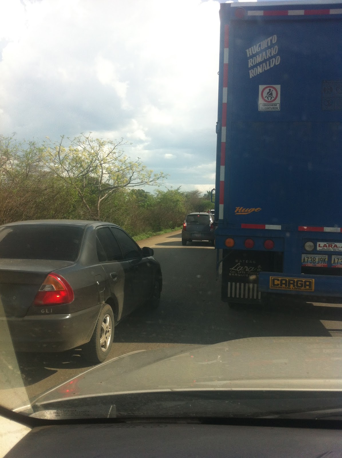 Como suele pasar con relativa frecuencia, los choques afectan el tránsito en la carretera que une a la capital con el tercer puerto del país, valga insistir: Una carretera y no una autopista. Como ven, una gandola perdió el control y colisionó dejando la carga atravesada en la vía, con lo cual los que van y vienen se pelean el tránsito en el espacio que queda para pasar. Se arma la cola y mientras llegan las ¿autoridades?, los venezolanos sacan a relucir sus peores maneras, lo que me permite mostrarles la siguientes gráficas: