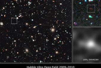 Arriba: Imagen detallada del objeto observado por el Hubble. Crédito: NASA, ESA, G. Illingworth (Universidad de California, Santa Cruz), R. Bouwens (Universidad de California, Santa Cruz, y Universidad de Leiden), y el Equipo HUDF09.El pequeño y ténue objeto es una galaxia compacta de estrellas azules que existió unos 480 millones de años después del Big Bang. Se necesitarían más de 100 de esas mini-galaxias para formar nuestra Vía Láctea. La investigación ofrece sorprendente evidencia de que la tasa de nacimiento estelar en el Universo inicial creció dramáticamente, aumentando por cerca de un factor de 10 desde 480 millones de años a 650 millones de años después del Big Bang.