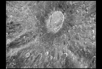 Esta imagen, tomada con la Cámara Avanzada para Inspecciones del Hubble, revela características tan pequeñas como la banda de 170 metros de ancho. El gran “ojo de buey” en la parte superior de la imagen es el cráter de impacto, causado por un asteroide hace unos 100 millones de años. Los senderos brillantes que se expanden desde el cráter se formaron por el material expulsado de la zona de impacto durante la colisión del asteroide.