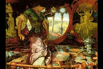 El poeta inglés Tennyson compuso en 1842 su obra La Dama de Shalott. Una maldición desconocida lleva a una mujer a ser encerrada en una torre. Sólo puede ver el mundo exterior a través de un espejo, mientras teje y teje sin parar lo que por él ve. Nada de lo que observa la impresiona, sólo lo mira, lo comprende, y lo elabora en su tejar con su hilo permanente. Así se mantuvo tranquila y sosegada. Hasta que un día ve el reflejo del caballero Lancelot, entonces comienza a sentir algo parecido al dolor, entonces no puede dejar ya de pensar que ha perdido todo su tiempo, que está cansada de todo ya. Harta estoy de tinieblas, se decía.
