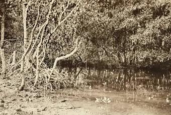 Mangles cerca de Kaele. Picturesque New Guinea (M.J.W.Lindt, 1887)Y por el camino embadurné cuatro raíces húmedas con el alquitrán que había en la lata, a escondidas, y sin que lo supieran los salvajes, que de tos modos no tenían ni idea de lo que era el alquitrán. Cuando regresamos, le entregué las raíces a Ben, y le dije lo que debía hacer. Entonces esperé tranquilamente a ver qué pasaba. Entonces Ben, y su esposa, y el sumo sacerdote tuvieron una charla, y Ben le entregó las raíces de los mangles húmedos que no tenían alquitrán al sumo sacerdote, y le preguntó si podía hacerlos arder, al mismo tiempo diciéndole que él podría quemar las suyas. Pude ver que la jugada de Ben dejó pasmao al sacerdote, que por supuesto no era ningún tonto aunque fuera un salvaje; pero puso buena cara, e hizo bajar al campamento a algunos de los negros a por teas. En un momento regresaron con las teas, e hicieron una gran fogata en la arena, y el sacerdote tomó sus raíces de mangle húmedas y dio varias pasadas sobre ellas, y murmuró y rezó tan normal como cualquier sacerdote real que haya visto y entonces sacó del fuego el mayor peazo de madera ardiente que pudo ver, y la raíz de mangle más pequeña que pudo encontrar en el montón, y la mantuvo sobre la llama; pero sólo burbujeó y chisporroteó, y aunque continuó sujetándola sobre la llama, no había quemadura alguna en ella; y finalmente se apagó el fuego en la rama, y los negros que estaban alrededor miraron solemnes, como diciendo: "¿Qué estás tratando de hacer, viejo? No has vivío lo suficiente pa’ saber que las raíces de mangle húmedas no se queman?” Y el viejo sacerdote parecía bastante avergonzao de sí mismo por mostrar a la gente de allí que había algo que no era capaz de hacer. Entonces Ben se adelantó, sonriendo, con sus raíces de mangle pringás con el alquitrán, e hizo una reverencia al público, y tomó una de las raíces y la mantuvo sobre una llama, igual que el sacerdote había hecho, y el alquitrán que estaba en ella prendió de golpe, y ardió como yesca. Y por supuesto los salvajes lo vieron de enmediato, y tol mundo inclinó la columna, y tocó la arena con la frente ante Ben, y el sumo sacerdote también se inclinó, y se arrastró de rodillas ande Ben estaba, y besó sus pies.