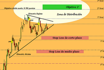 Para aquéllos posicionados en liquidez o confiados en un escenario bajista, encontramos una cotización del selectivo en plena línea directriz alcista, iniciada el pasado mes de agosto. Si se perdiese el nivel de los 7.700 puntos, la salida de papel al mercado, previsiblemente se vería incrementada, reforzando las tesis bajistas, con una etapa de distribución que estaría llegando a su fin.