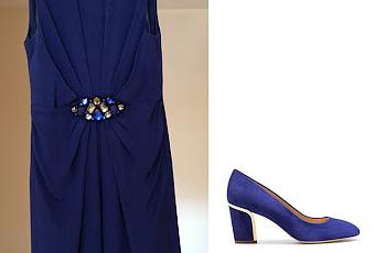O poner un poquito de color. Los zapatos en azul noche como el vestido. Media tupida negra si el zapato es de tacón ancho; y si es fino, podemos elegirla más fina si nos apetece. Cartera de mano, también en azul noche. Abrigo de corte recto, sin cuellos, con abotonadura delantera, en color negro.