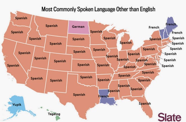 ninguna otra lengua de inmigrantes jamás ha alcanzado; ni siquiera el alemán, ni el francés ganaron tal difusión y aceptación, de tal manera que sus culturas y lenguas formen parte del patrimonio de la sociedad estadounidense, como ha conseguido el español. El mapa no es del trabajo anterior, procede de Laughing Squid,Edw Lynch