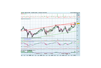 Red Eléctrica lleva desde mediados del 2008 en un canal alcista de poca pendiente, y desde mediados del 2011 una resistencia en los 39,15€ le ha impedido volver a alcanzar la parte alta de dicho canal.