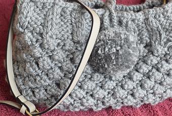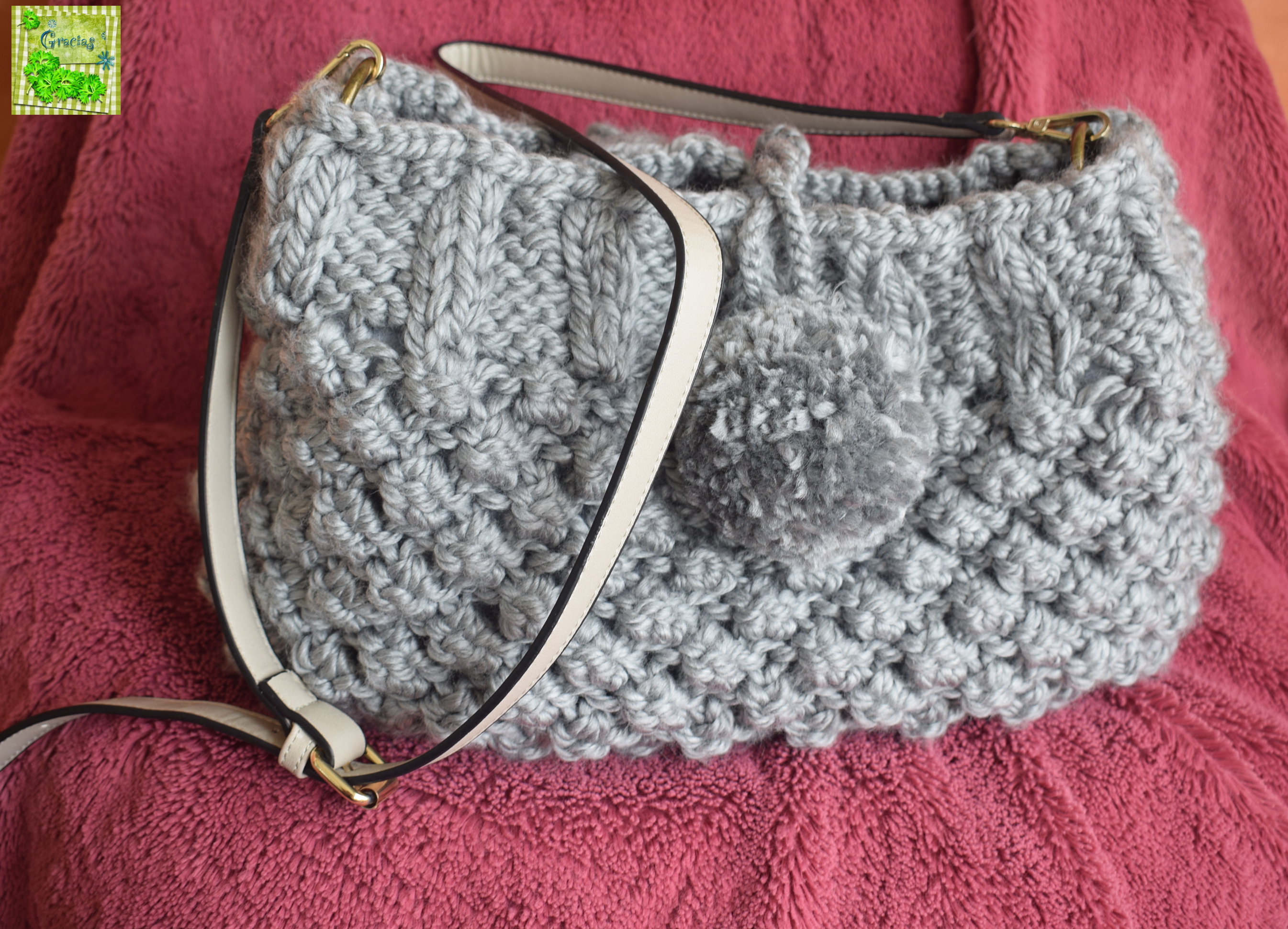 El bolso está tejido a punto de garbanzo y la parte de arriba es a punto elástico, en una sola pieza, cosido por los laterales. El forro interior es de tela, cosido a mano. He puesto argollas cosidas al forro donde se engancha el asa. Para cerrar el bolso he hecho una cadeneta de ganchillo y un borlón grande que hace las veces de cierre, a modo de botón.