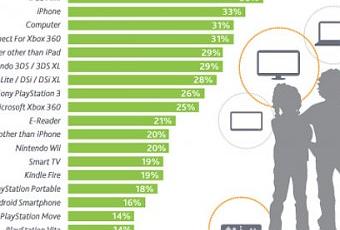 La sigue el dispositivo de Nintendo Wi U, video consola sucesora de la Wii que se lanzó apenas hace unos días al mercado, esta es una novedad que ha permitido que Nintendo (su nueva consola) pase a ser una de las principales preferencias de los niños acaparando un 39%, si comparamos con las preferencias de la Wii del año pasado (un 11%), podemos comprobar que el salto es muy elevado. Parece que los productos de Apple encabezados por el iPad, siguen haciendo estragos entre la infancia, en tercera posición se clasifica el iPod Touch con un 36% (un 6% más que el año pasado) y con el mismo porcentaje el iPad Mini, le sigue de cerca con un 33% el iPhone que incrementa su cuota en un 6%.