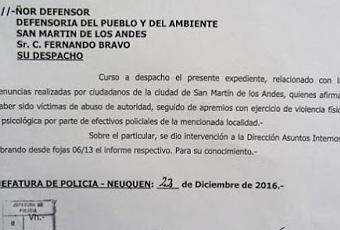 La Defensoría del Pueblo y del Ambiente de San Martín de los Andes recibió respuesta del Jefe de la Policía del Neuquén, Comisario General Rubén Tissier, a su nota enviada el pasado 7 de diciembre, en la que solicitaba a la Jefatura de esa fuerza informes sobre los casos de apremios policiales en perjuicio de ciudadanos y ciudadanas Sanmartinenses, denunciados en 2016 y 2015, algunos de los cuales incluso tomaron estado público. La respuesta de la Jefatura incluye 13 hechos con detalles de las actuaciones internas de la fuerza policial, que se sustraen del informe público de la Defensoría.