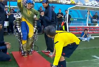 Este jueves en la inauguración de Brasil 2014, uno de los momentos más anunciados terminó como una simple toma apurada e incompleta, de un par de segundos, donde vimos a un joven de 29 años llamado Juliano Pinto (después de buscar en muchas notas de diversos medios finalmente encontré su nombre). Parapléjico, fue el encargado de dar el puntapié inicial de la Copa del Mundo, ayudado de un exoesqueleto controlado por su cerebro.