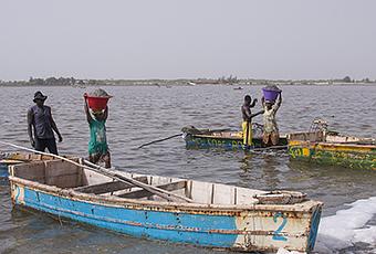 El recorrido comienza visitando las salinas donde los hombres de la cercana aldea de Niaga peul, se esfuerzan en extraer la sal de los fondos poco profundos, a bordo de una rudimentaria embarcación, trasladandola hasta las orillas, donde las mujeres la transportan en cubos sobre su cabeza, para amontonarla y tierra adentro, donde se dejará secar.