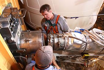 Arriba: Los técnicos en la Plataforma de Lanzamiento 39A en Florida, reubican la línea de ventilación a la placa terrestre transportadora umbilical (GUCP). Crédito: NASA/Ben Smegelsky.Debido a estas reparaciones, la NASA tomó la decisión de retrasar el despegue de Discovery STS-133 hasta no antes del 3 de diciembre a las 2:52 EST (3:52 horario de Buenos Aires). El inicio de la cuenta regresiva será a partir del 30 de noviembre.