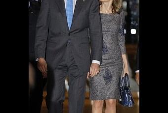 Dña. Letizia eligió un bonito vestido a la rodilla y de manga larga de Felipe Varela, en tono azul grisáceo jaspeado con rosetones bordados, que casualmente había llevado anteriormente en Oviedo en un acto de la Fundación Príncipe de Asturias, en septiembre pasado. En aquélla ocasión también lo combinó con mocasines bicolor de tacón, de un estilo más casual.