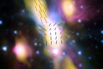 Los astrónomos han encontrado la primera evidencia de un campo magnético en un chorro de material eyectado desde una estrella joven, un descubrimiento que apunta hacia avances futuros en la comprensión de la naturaleza de todo tipo de chorros cósmicos y del papel que los campos magnéticos juegan en la formación estelar.Izquierda: Chorros de radio emitidos por una estrella joven (de color amarillo en el fondo) en esta imagen obtenida por el Telescopio Espacial Spitzer. Las barras amarillas muestran la orientación del campo magnético en el chorro medido por VLA. Las barras verdes muestran la orientación del campo magnético en el envoltorio de polvo que rodea a la joven estrella. A los lados del chorro se pueden ver otras estrellas jóvenes. Crédito: Carrasco-Gonzalez, Curran, Bill Saxton, entre otros. NRAO/AUI/NSF, NASA.