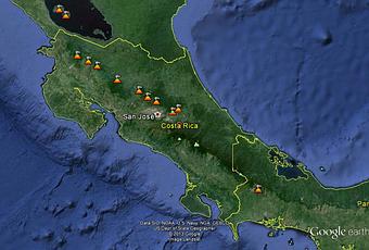 Imagen 1: Mapa de Costa Rica según Google Earth. Solo se muestran los bordes fronterizos, el nombre de los países, su capital y montañas y volcanes relevantes (Fuente: Google Earth)