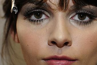 Varanasi: maquillaje multicolor que destaca los ojos y el resto del rostro es limpio: labios nude y piel también blanca.