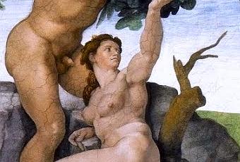 El relato sagrado lo cuenta así: Y como viese la mujer que el árbol era bueno y una delicia para los ojos, tomó de su fruto y comió. Y dió también al hombre, que estaba a su lado, y él comió también. Curiosamente, el relato es fiel a lo que pintó Miguel Ángel, o al revés, mejor dicho. En ningún caso el Génesis describe una intervención de la vil serpiente metafórica, salvo para verbalizar en la mente de Eva unas palabras tranquilizadoras, unas pronunciadas por ella misma sobre el hecho de desmentir el consejo -que no prohibición- que Dios le habría hecho a ella: No comáis de él, ni lo toquéis, no sea que muráis. Y Miguel Ángel solo se permitirá aquí una libertad iconográfica: transformar la torticera serpiente en parte de una réplica a Eva de otra mujer, su propia conciencia. Pero, hay algo más. En el fresco de la bóveda sixtina compuso el gran artista toscano dos escenas: a la izquierda, la caída, la tentación; a la derecha, la expulsión del paraíso. Son los mismos seres, pero no lo son... En la expulsión están hundidos ambos, avejentados, trastornados, destrozados, separados los dos casi en su caminar ahora desorientado. Sin embargo, en la izquierda de la imagen del fresco están los dos como nunca se habrán representado en ninguna imagen artística, ni antes ni después, en toda la historia. Están aquí ellos dos juntos, enfrentados sensualmente, satisfechos e inocentes, pero con una erótica actitud que, ahora que lo vemos -no antes, en el Renacimiento, cuando desde tan lejos fuesen poco visible los detalles de su belleza-, pensaremos qué necesidad tendrían ya ellos -ni siquiera de conocimiento- de comer la fruta de ese maldito árbol...