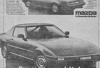 Al menos lo anunciaban como disponible para la venta a través del diario Clarín en marzo de 1981. Además en el aviso publicitario se hace mención a los triunfos deportivos del RX-7 y los récords batidos. En especial por el modelo de carrera que corrió en el campeonato de IMSA (International Motor Sports Association) en Estados Unidos.