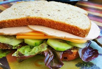 - Colocamos encima de una rodaja las hojas de lechuga, las rodajas de pepino, las lonchas de jamón y de queso, tapamos con otra rebanada de pan y servimos.