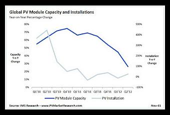 Ahora bien, el problema que se le presenta al mercado, es que la "oferta" (capacidad de fabricación) excede y por mucho la demanda mundial, donde las más positivas de las estimaciones consideran entre unos 23-27 GW los instalados durante 2011, de acuerdo a un informe publicado por la consultora especializada IMS Research.