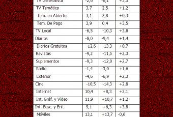 En el caso de internet las previsiones hablan de un crecimiento del 10,4 por ciento (nuevamente se espera que con mayor incidencia en gráfica y vídeo que en buscadores y enlaces) y en los canales temáticos del 3,7 por ciento. Si bien para el resto de medios se esperan caídas, éstas serán menores de las esperadas hace dos meses.