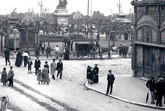 El mercado de la Ribera era la plaza de abastos de la época y estaba situado donde ahora está Correos. Como en los alrededores de todos los mercados el ambiente estaba asegurado. En la imagen se ven sardineras, niños con ruedas y palos, un carro tirado por caballo, caballeros de charla a la puerta de la barbería.