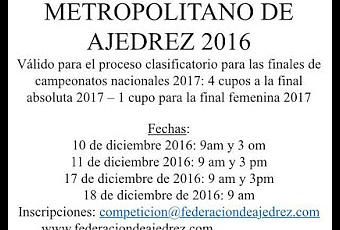La dirigencia FCA trabaja en los detalles últimos de las bases del tradicional Torneo Metropolitano, un torneo muy querido por generaciones anteriores y que es bueno que esto lo sepan la generación actual. Cuando estén disponibles las bases de competencias se las pondremos por acá y con ello, informándoles que número de edición seria esta.Muchos diciembres atrás centenares de ajedrecistas han disfrutado de los vientos alisios y el ambiente festivo que depara el andar por las calles Josefinas con el bolso del ajedrez al hombro y la emoción de saber que nos toparemos a un centenar de fiebres como uno mismo.