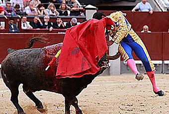 El torero mexicano Ignacio Garibay resulto ayer herido grave en el muslo derecho con una cornada muy fea, cuando muleteaba al cuarto toro, segundo de su lote, de nombre Morito, de 672 kilos, un cárdeno oscuro veleto muy guapo, mas grande que un trolebús, pero que no valía ni para tirar de las carretas en la Romería del Rocío. En el capote el toro salía suelto y con la cara arriba sin humillar. Era muy corretón y abanto pues mostró su mansedumbre barbeando las tablas de la barrera por toda la plaza. Vamos... un manso “pregonao” que no quería ni ver al caballo. Tuvo una lidia desordenada y descompuesta mas por la mansedumbre del elefante que por la eficacia de los toreros que hicieron bien su trabajo. Ignacio Garibay se dobló con el toro al inicio de la faena y, como era manso, lo sacó a los medios. Allí le atacó con oficio y valentía, pero el bicho embestía sin celo y con la cara arriba. A la salida de un pase de pecho el buey logró empitonar al torero por la parte exterior del muslo derecho infiriéndole una cornada que a la postre fue grave. El mexicano voló por los aires y recibió después en el suelo una enorme paliza, pues el bicho era manso pero con muy mala leche. Ignacio Garibay intentaba quitarse a la fiera de encima y en ese tira y afloja, el toro le dio en la boca un golpe con la pala del pitón que le tiró al suelo varios dientes. Ignacio Garibay arriesgó mas de la cuenta y el toro es que no valía la pena. Con la cornada en el muslo, sangre en la boca y sin inmutarse el torero mexicano hizo un acopio de valor inmenso y se fue por la espada. Con media estocada y cinco descabellos lo despacho al otro mundo, y él se fue como los toreros machos andando por su pié a la enfermería como si tal cosa... donde fue intervenido de urgencia.