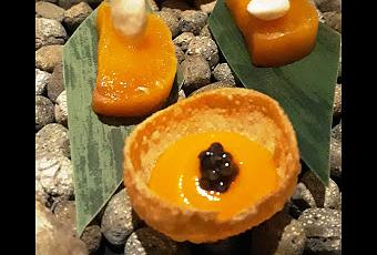 - Hueva de mújol curada en casa y almendra marcona. Es una especie de mojama blanda. El peor entrante en sabor y textura