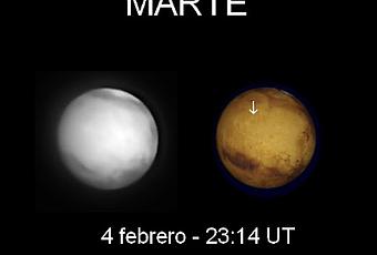 El planeta Marte centrado sobre la llanura de Tharsis. He señalado con una flechita en la imagen generada por el programa Cartes du Ciel el Monte Olimpo, el mayor volcán del sistema solar, con una altura superior a los 21 km y una base de 600 km. En mi imagen, en blanco y negro, se aprecia esta base con un tono ligeramente más brillante que la zona que la rodea. Y aunque muy sutilmente, hace ilusión haberlo captado.